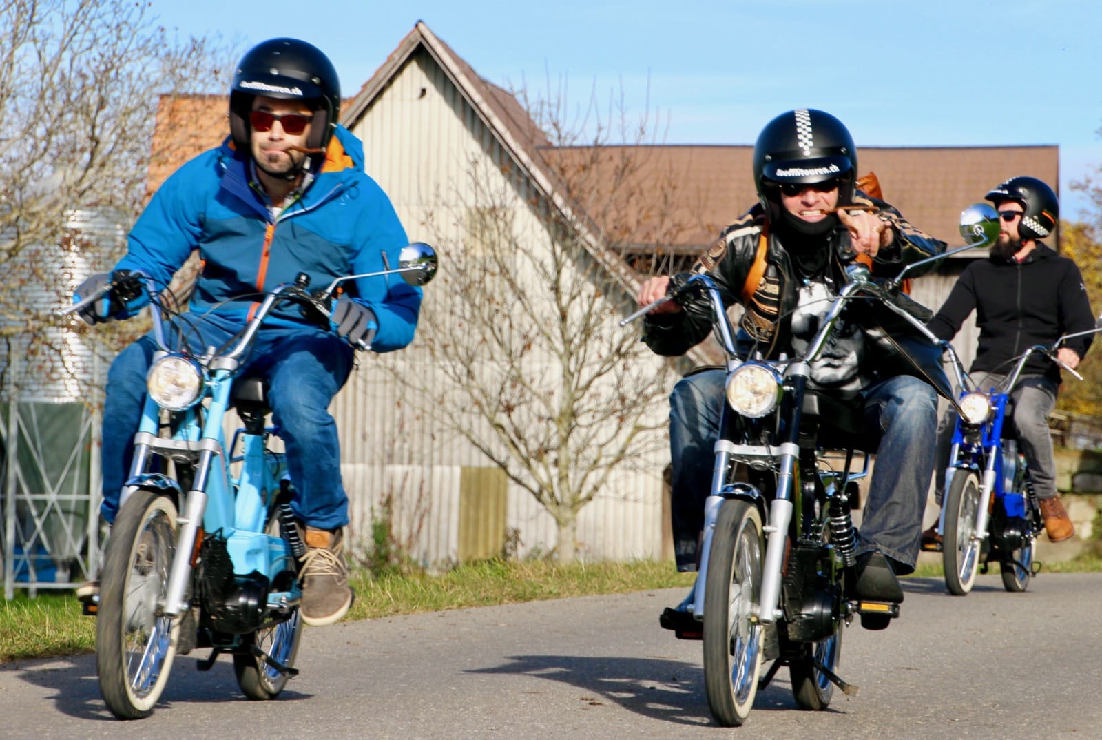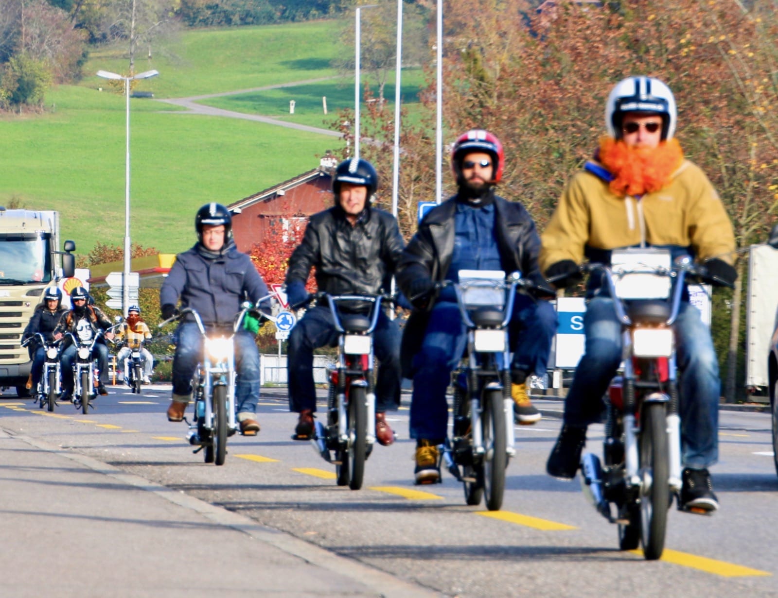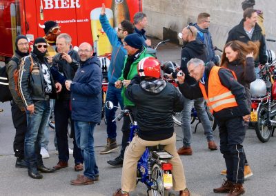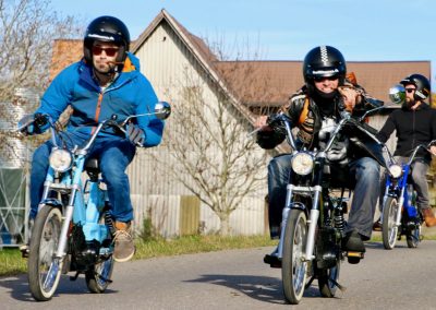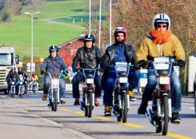 Nun gab es kein Halten mehr. Die Motoren knatterten, Auspuffe und die „Krummen“ qualmten um die Wette. Einige holten Verkleidungsutensilien hervor und nur schon der Anblick der ganzen Gruppe sorgte für allgemeines Gelächter. Als wäre die Zeit 20, 30 oder gar 40 Jahre zurück gedreht worden, fuhren alle wild durcheinander, kreuz und quer auf dem Parkplatz herum und andere versuchten gleich wieder über die Auflagerampe zurück in den Anhänger zu fahren, was auch tatsächlich auf Anhieb gelang. Auf allen Gesichtern war ein breites Grinsen zu sehen und das wilde Treiben als chaotisch zu beschreiben, wäre wohl untertrieben. Nachdem Toni Rogenmoser ein paar vergebliche Versuche unternommen hatte, um ein Gruppenbild zu schiessen, machte sich der qualmende Mob bei strahlendem Sonnenschein zum 2-Takt-Geknatter-Konzert auf den Weg. Die Bremsen wurden gelöst und ein Tatzelwurm wand sich über Strassen und Feldwege durch die herbstliche Landschaft. Wie die Teenies lieferten sich manche ein Rennen, andere versuchten einfach möglichst kreativ auf dem Mofa zu sitzen. Es gab auch welche, die sahen einfach cool aus und genossen den Fahrtwind und die Sonne, die sich in den verspiegelten Sonnenbrillen reflektierte. Es gab Motocross-Einlagen, herzhafte Jauchzer, Victor-Zeichen und jede Menge tolle Bilder, welche mehr sagen als tausend Worte.