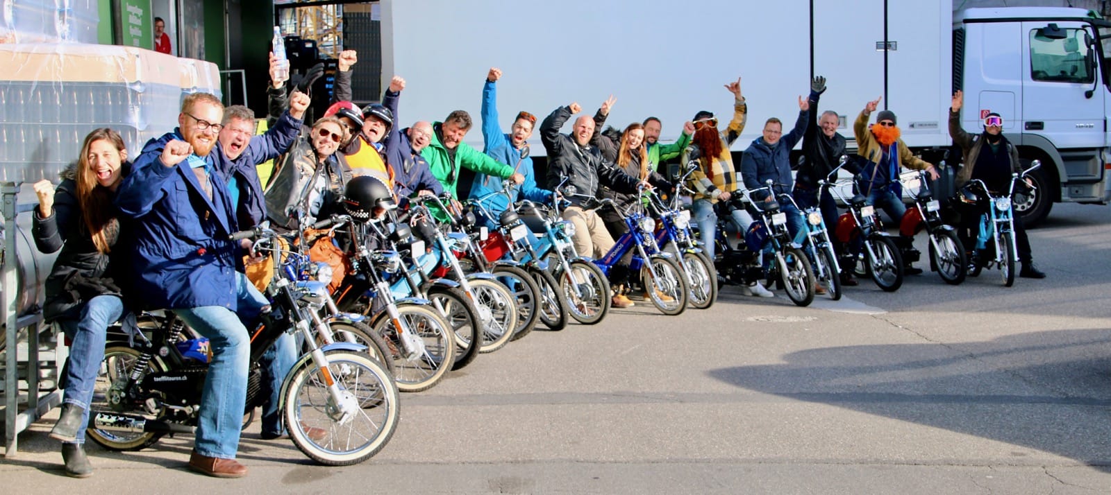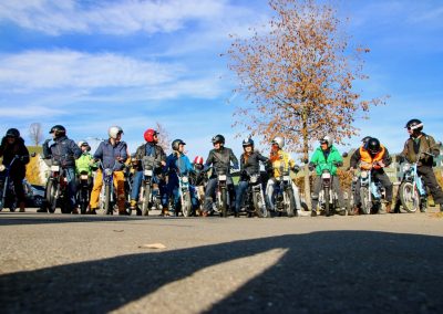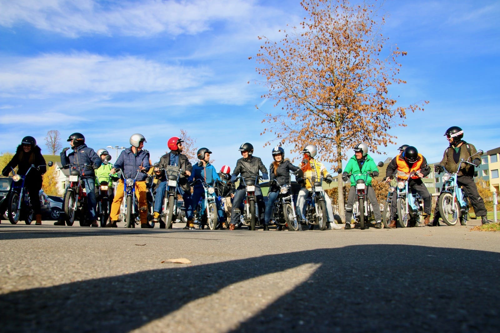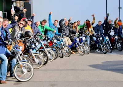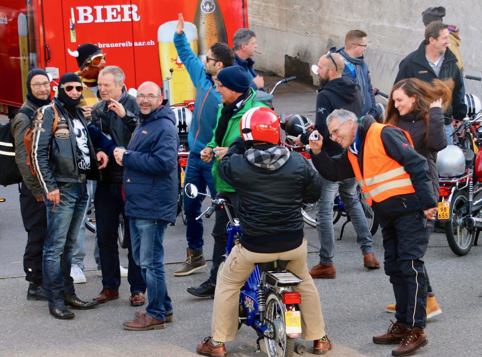 Nun gab es kein Halten mehr. Die Motoren knatterten, Auspuffe und die „Krummen“ qualmten um die Wette. Einige holten Verkleidungsutensilien hervor und nur schon der Anblick der ganzen Gruppe sorgte für allgemeines Gelächter. Als wäre die Zeit 20, 30 oder gar 40 Jahre zurück gedreht worden, fuhren alle wild durcheinander, kreuz und quer auf dem Parkplatz herum und andere versuchten gleich wieder über die Auflagerampe zurück in den Anhänger zu fahren, was auch tatsächlich auf Anhieb gelang. Auf allen Gesichtern war ein breites Grinsen zu sehen und das wilde Treiben als chaotisch zu beschreiben, wäre wohl untertrieben. Nachdem Toni Rogenmoser ein paar vergebliche Versuche unternommen hatte, um ein Gruppenbild zu schiessen, machte sich der qualmende Mob bei strahlendem Sonnenschein zum 2-Takt-Geknatter-Konzert auf den Weg. Die Bremsen wurden gelöst und ein Tatzelwurm wand sich über Strassen und Feldwege durch die herbstliche Landschaft. Wie die Teenies lieferten sich manche ein Rennen, andere versuchten einfach möglichst kreativ auf dem Mofa zu sitzen. Es gab auch welche, die sahen einfach cool aus und genossen den Fahrtwind und die Sonne, die sich in den verspiegelten Sonnenbrillen reflektierte. Es gab Motocross-Einlagen, herzhafte Jauchzer, Victor-Zeichen und jede Menge tolle Bilder, welche mehr sagen als tausend Worte.