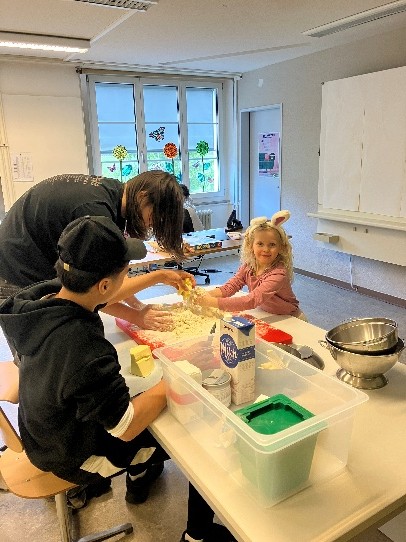 Der Donnerstag brachte schliesslich Osterstimmung pur. Beim kreativen Basteln entstanden liebevoll gestaltete Nestli, während in der Küche fleissig Oster-Stracciatella-Kekse gebacken und süsse Teighäsli geformt wurden. Der Duft von frisch Gebackenem lag in der Luft und sorgte für eine besonders gemütliche Atmosphäre. Das kleine Osterhäsli in Gestalt der Tochter einer Lehrperson trug auch zur netten Atmosphäre bei.